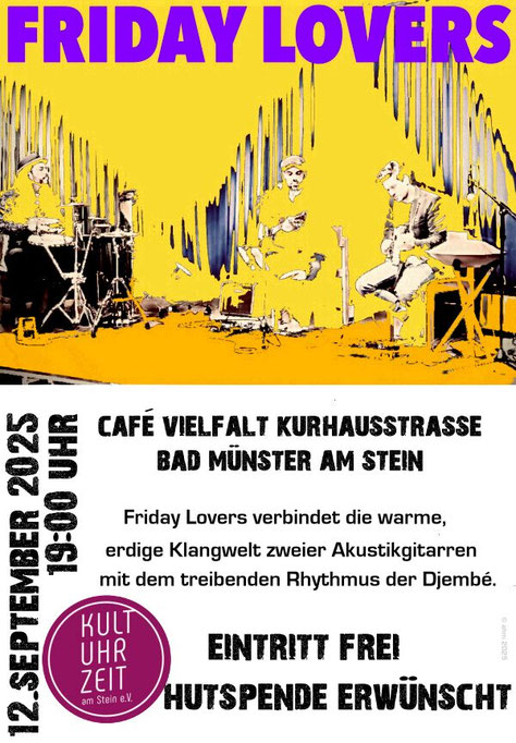Auf Einladung des Vereins KultUhrZeit am Stein spielen die Beiden nach ihrem leider etwas verregneten Konzert im letzten Jahr erneut am Fähranleger im Kurpark Bad Münster. Beginn ist 19.00 Uhr. Sonnenschein wurde bestellt.